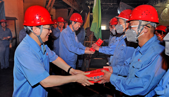 焦化厂和炼铁厂高温岗位较多,夏季现场作业条件更为艰苦。张志方一行先后来到焦化厂炼焦作业区和炼铁厂4350立方米高炉作业区看望慰问一线职工,送上防暑降温用品。