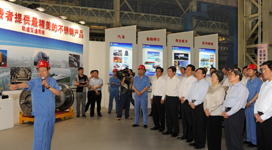 在不锈冷轧厂产品展台前,太钢董事长李晓波向代表团一行汇报了太钢发展情况。他说,近年来,在山西省委、省政府“转型跨越发展,再造一个新山西”的战略部署下,太钢依托转型综改试验区建设大平台,围绕做强主业、延伸发展、多元发展、绿色发展、和谐发展的总目标,加快转变发展方式,努力提高发展质量效益,企业综合竞争力显著提升。李晓波着重介绍了太钢发展循环经济、建设绿色钢厂和实施创新驱动战略、依靠科技支撑开发特色和高端产品的途径及成效。孙春兰仔细观看了展示区产品,当了解到太钢产品在石油化工、核电、电站锅炉、电力、轨道交通、汽车、船舶桥梁、航空航天、民用等领域得到广泛应用情况时,对太钢依靠科技创新和技术进步,改进工艺技术,优化品种结构,实现逆势增长的做法给予充分肯定,她希望太钢继续扩大高端特色产品的研发推广力度,持续提升企业核心竞争力。