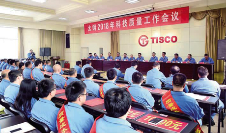 太钢集团董事长、党委书记、总经理高祥明就全面深化科技质量工作作讲话。太钢集团党委常委、太钢不锈董事长张志方主持会议。