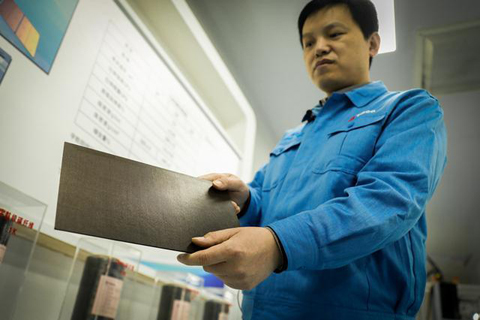 李登华向记者展示碳纤维复合材料板材。人民网记者 王帆摄