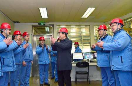 图为楼阳生在太钢不锈冷轧厂看望慰问生产一线职工。 白治斌 摄