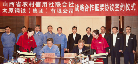 4月6日,太原钢铁(集团)有限公司与省农村信用社联合社战略合作框架协议签约仪式在花园会议中心举行。公司董事长李晓波,集团公司总经理高祥明,集团公司总会计师韩珍堂,太钢不锈总会计师杨贵龙,省农村信用社联合社理事长崔联会、主任邢亮喜、党委副书记王再升出席签约仪式。公司相关副总级领导、相关部门负责人,省农村信用社联合社相关部门负责人参加签约仪式。