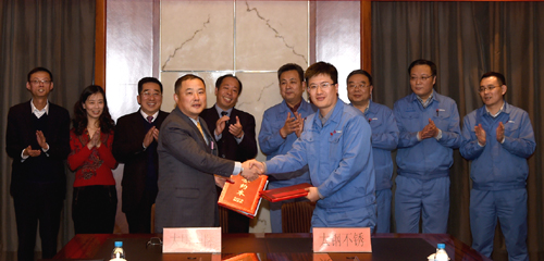 随后,太钢不锈营销总监尚佳君与周克明分别代表双方在合作协议上签字。根据协议,双方发挥各自优势,全方位加大市场开拓、用户服务、材料深加工、新产品开发等方面的交流与合作力度,提升差异化材料的服务能力,打造钢铁材料生产、加工、配送的完整产业供应链,提升服务价值,助力提高终端用户的市场竞争力。