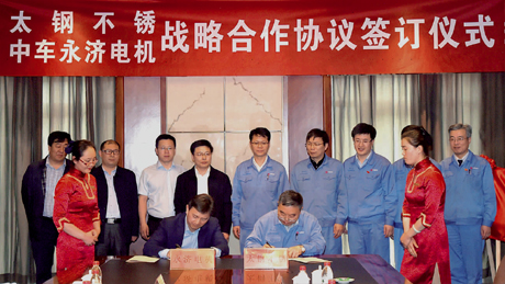 5月11日,太钢不锈与中车永济电机在花园会议中心签署战略合作协议。太钢不锈总经理张志方、中车永济电机总经理宁文泽出席。太钢不锈副总经理高建兵、相关副总级领导,中车永济电机副总经理郭永安参加。